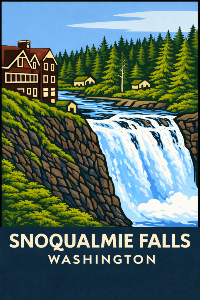 A 3D printed panel featuring Snoqualmie Falls and the historic Salish Lodge, famously associated with Twin Peaks, set against a forested Cascade Range backdrop.