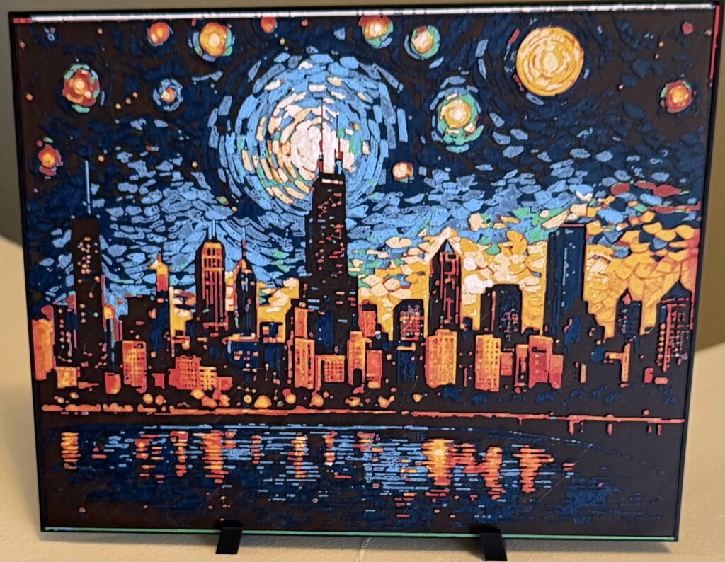 Inspired by Van Gogh’s Starry Night, this premium 3D printed panel reimagines the Chicago skyline with layered depth and vibrant detail. Approx.185 x 165 mm.