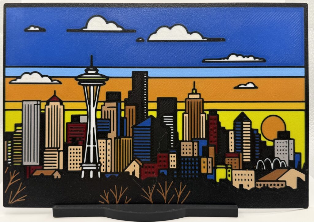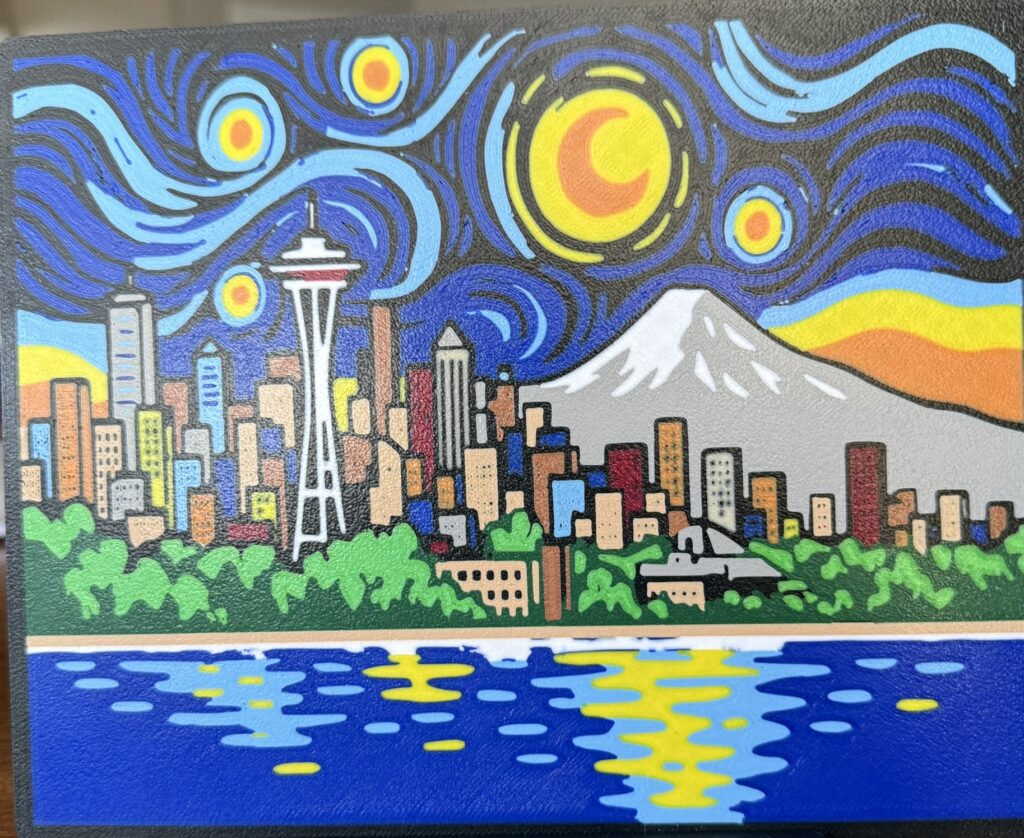 Inspired by Van Gogh’s Starry Night, this layered 3D printed panel features the Seattle skyline under a swirling night sky.