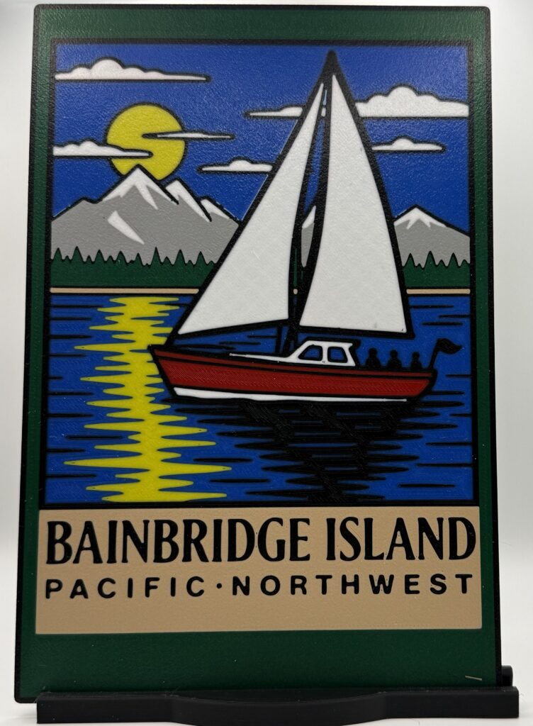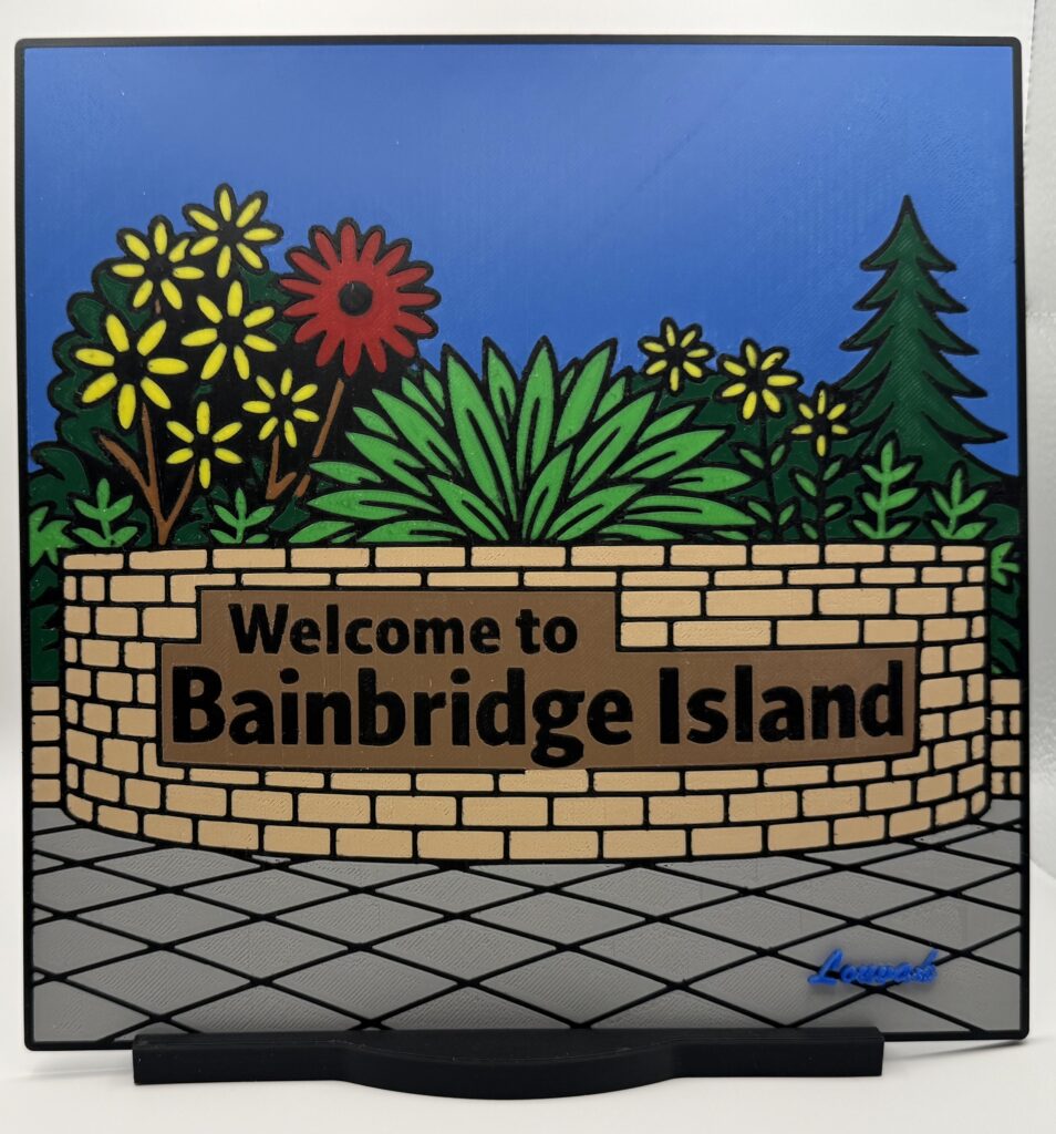 A layered 3D printed panel featuring the iconic welcome sign seen when departing the Seattle ferry.