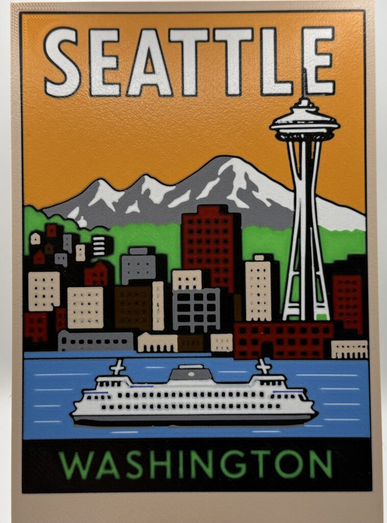 Featuring the Space Needle, Mt. Rainier, and Puget Sound ferry, this 3D printed panel captures the iconic waterfront skyline. Approx. 165 x 195 mm.