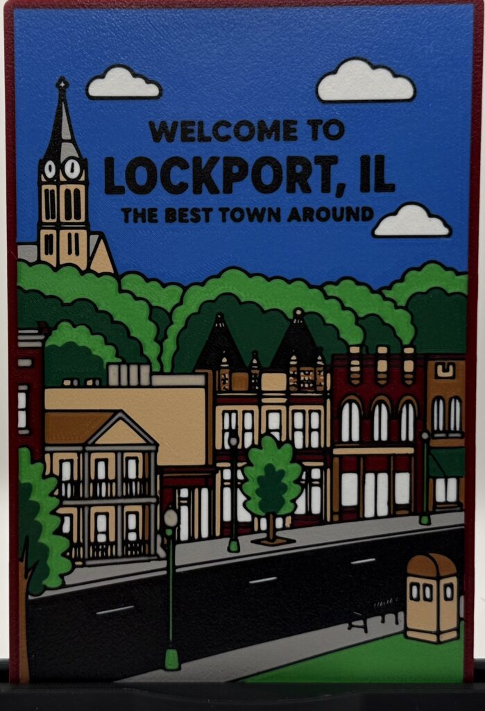A layered 3D printed panel featuring the iconic “Welcome to Lockport” sign and historic downtown skyline. Approx. 150 x 185 mm.