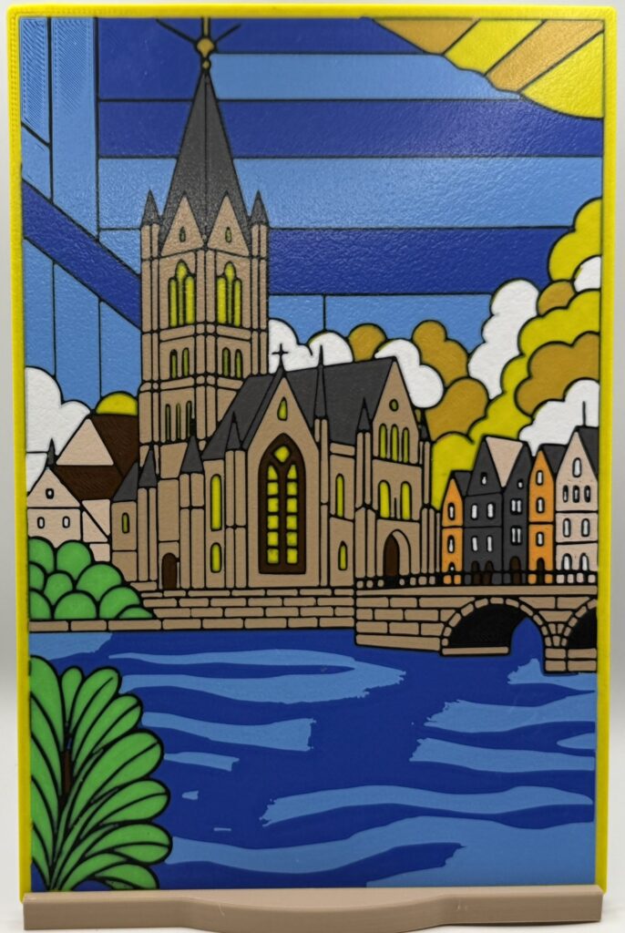 A 3D printed panel inspired by traditional stained-glass design, featuring Saint Bavo’s Cathedral and its reflection in the Leie River. Bold outlines and segmented color fields echo classic European cathedral windows while honoring the cathedral’s connection to the Ghent Altarpiece.