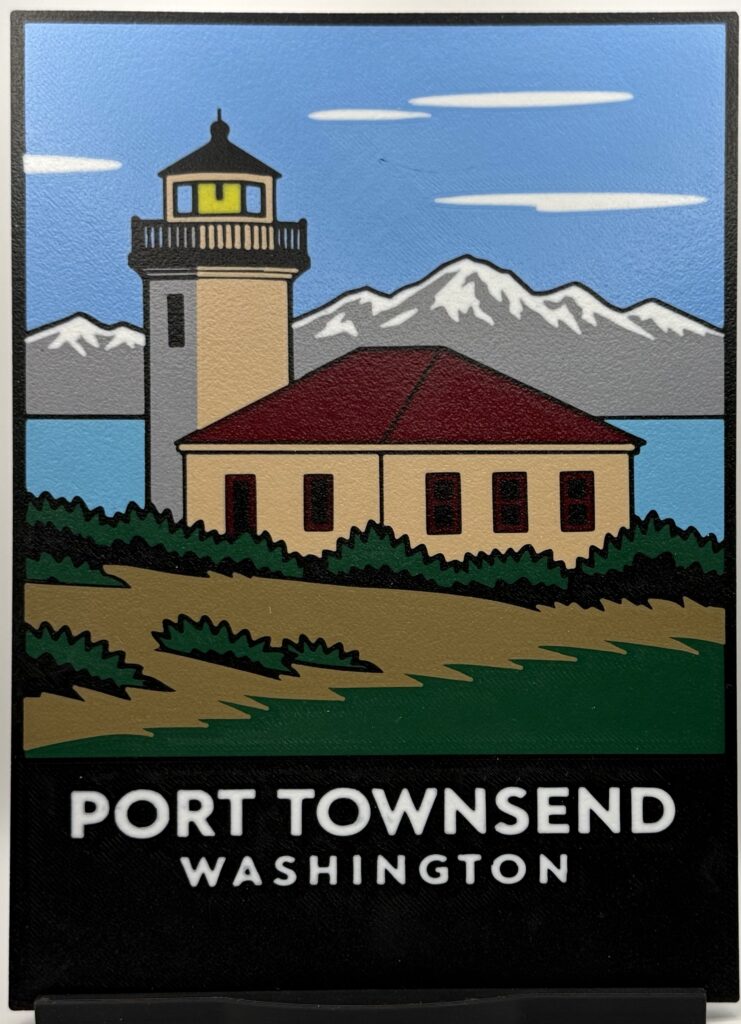 A 3D printed panel featuring the Port Townsend lighthouse with Cascade Range backdrop, rendered in bold, dimensional detail.