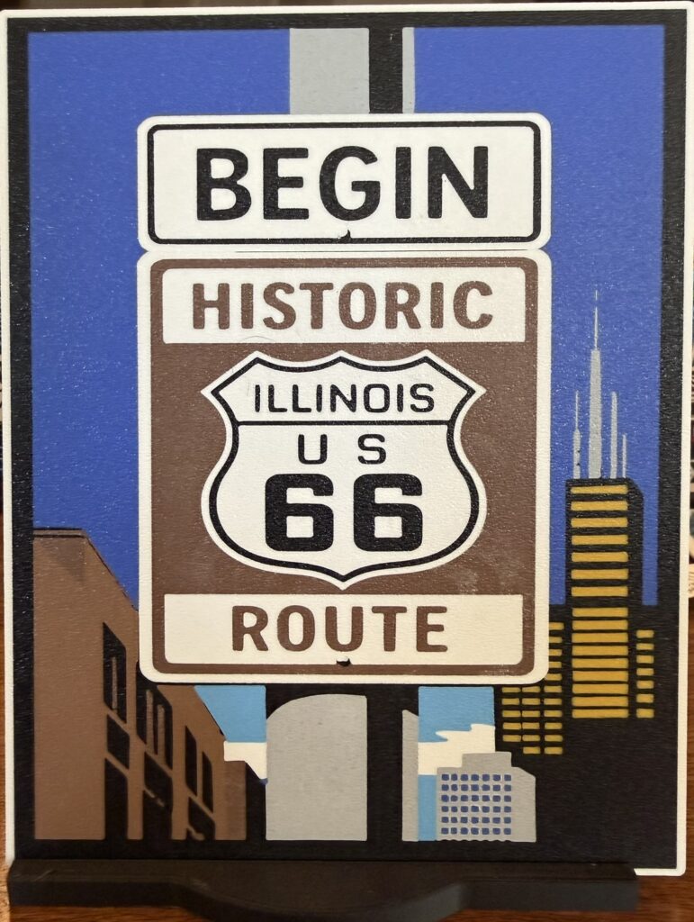Begin — Historic Illinois Route 66 Marks the historic eastern starting point of U.S. Route 66 in Chicago, Illinois. Established in 1926, Route 66 became America’s most famous highway, carrying generations of travelers west toward California in search of opportunity, adventure, and a new life.